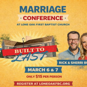 Marriage Conference | March 6–7 | Lone Oak FBC Strong marriages don’t happen by accident — they’re built with intention, faith, and the right foundation. Join us for our Marriage Conference on Friday, March 6 (7:00–9:00 PM) and Saturday, March 7 (8:30 AM–1:30 PM) as we invest in marriages that are built to last. We’re excited to welcome Rick and ...
