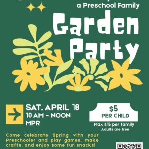 Come celebrate spring with your preschooler and play games, make crafts, and enjoy some fun snack! Cost is $5 per child, Max $15 per family. Adults are free.